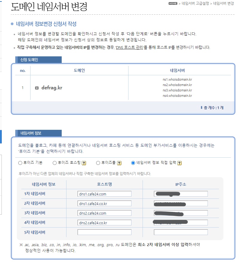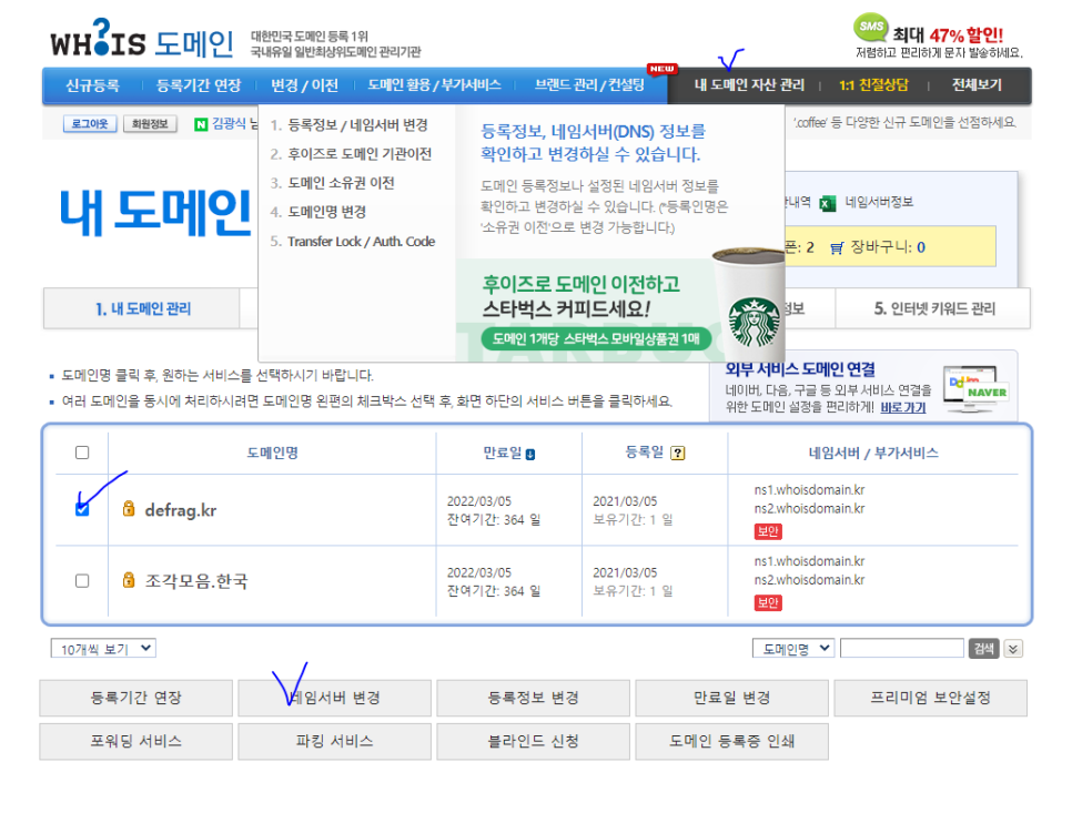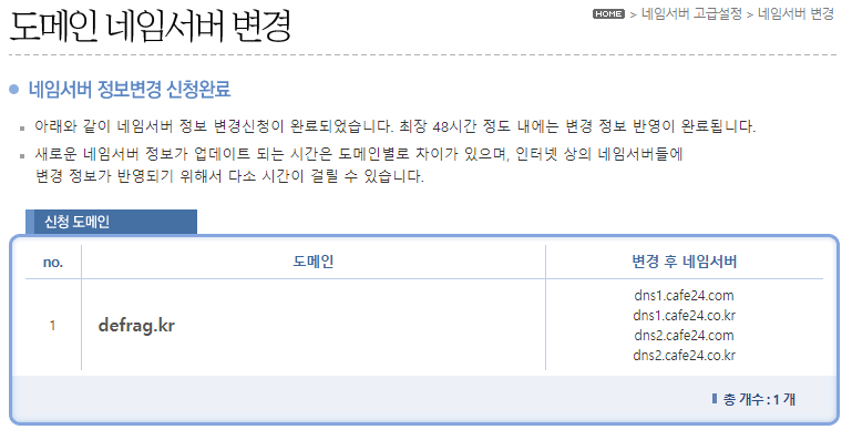 내 도메인 자산관리 > 도메인 선택 > 네임서버 변경