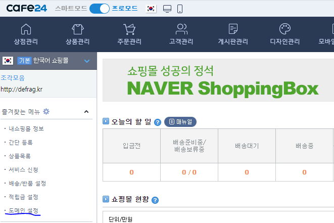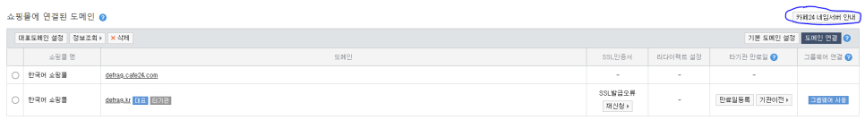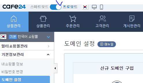 쇼핑몰에 연결된 도메인 부분에서 오른쪽 상단에