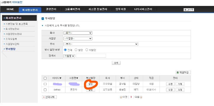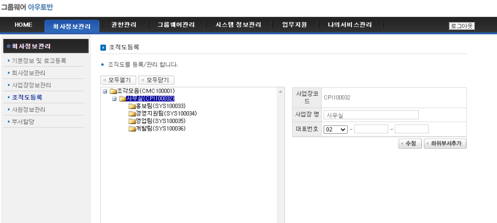 회사정보관리-조직도 등록에서 부서를 부여해줍니다!